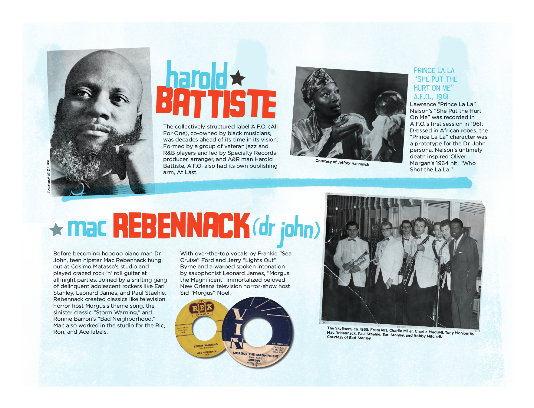 Panel from the Jazz Fest exhibit featuring Harold Battiste and Dr. John.